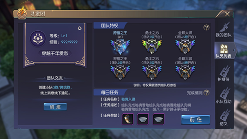 寻龙团成员拥有共同的成长目标。成员每天完成寻龙团的日常任务,可以提升寻龙团的等级。