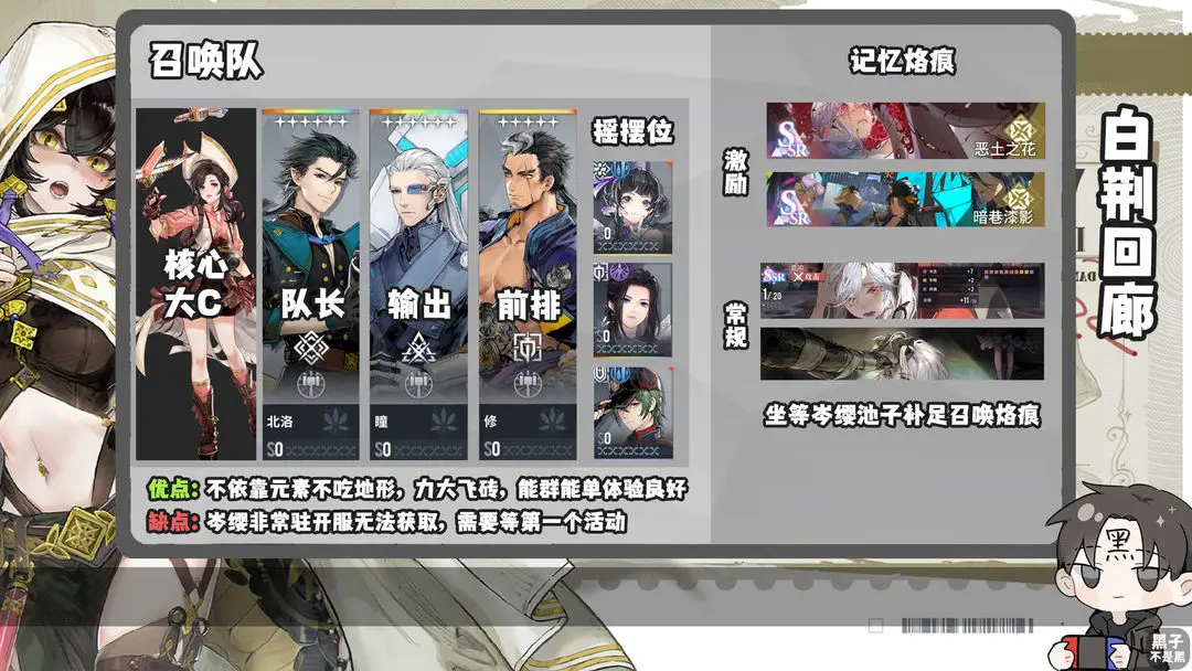 由于游戏公测会送自选的六星角色和ssr烙痕,所以在下面详细介绍每个体系角色烙痕构成的时候,会着重说明该体系所需的核心角色和烙痕。