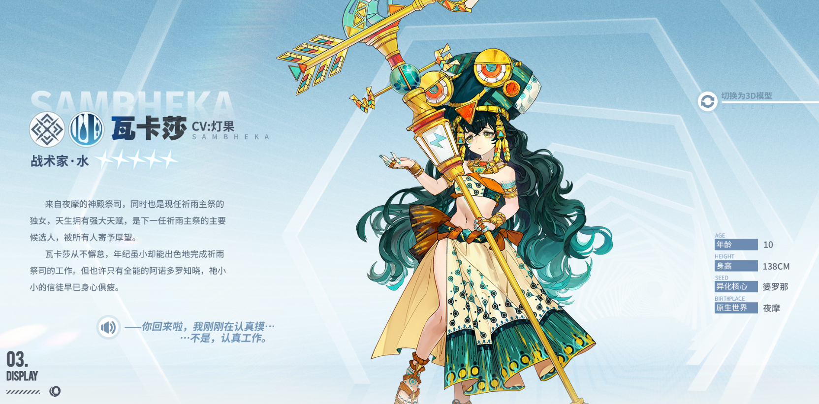 来自夜摩的神殿祭司,同时也是现任雨主祭的独女,天生拥有强大天赋,是下一任祈雨主祭的主要候选人,被所有人寄予厚望。