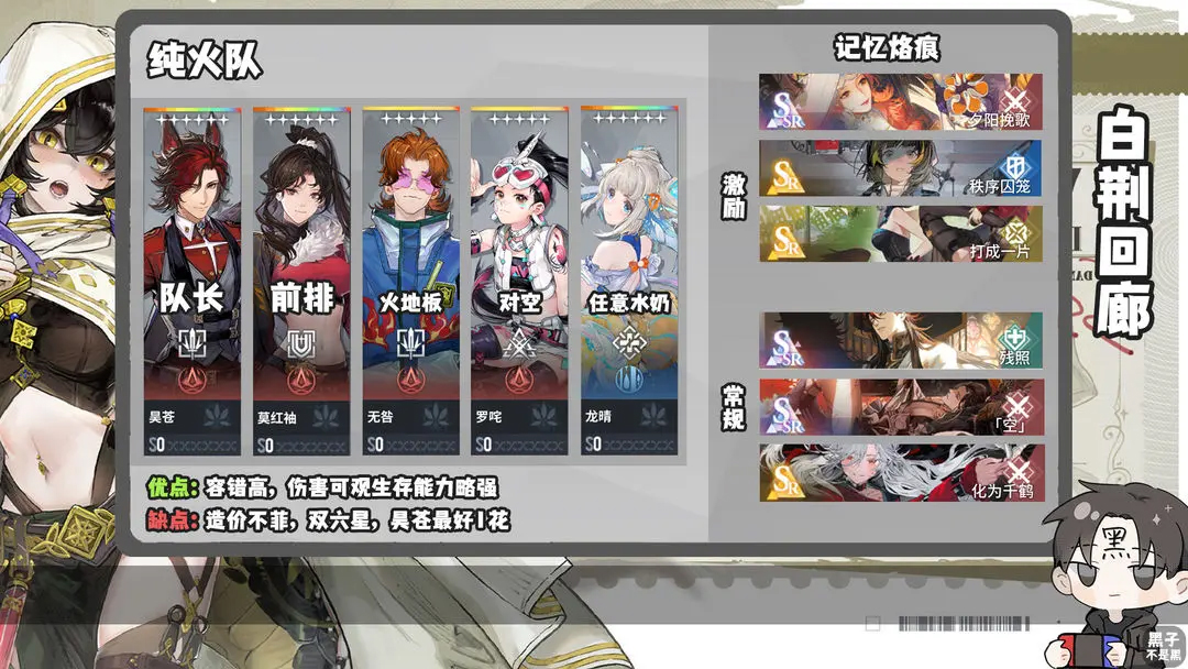 纯火队的构成是昊苍为队长,无咎为火地板工具人兼前排输出,罗吒作为对空输出手,莫红袖为前排坦克,常规情况下会再带一个水属性奶妈。无咎和昊苍可以不间断的铺火地板,这让莫红袖的格挡值增加基本上处于常驻状态,坦度大大提高。相比于火雷队纯火队的容错性更高。