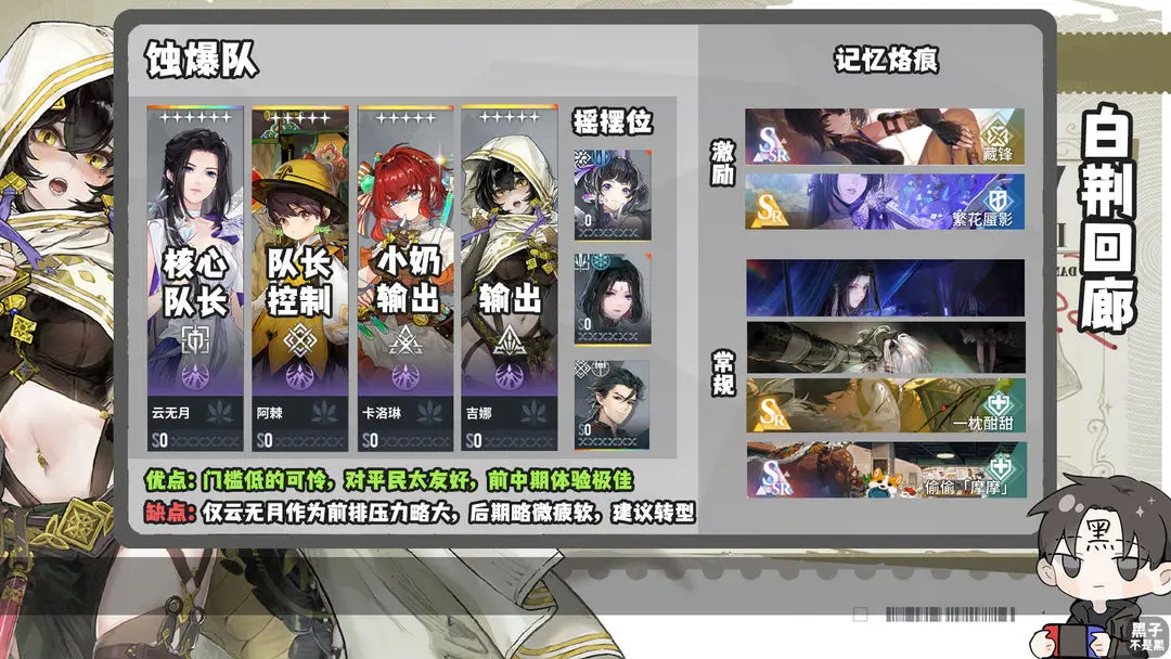 风队刚需烙痕血露薇绝密建议自选,其次推荐sr烙痕拂晓,瓦卡莎和岚岚的击退可以触发烙痕技能生人勿进,只要击退就可以造成成吨的伤害和减伤降低,十分好用的增伤卡。最后是适合白鸟梓的各种功能烙痕例如化为千鹤,空,千本之门。