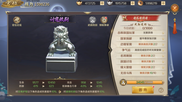 官位系统是里面提升战力最多的,但要求也比较高,提升官位需要获得相应的功勋,功勋可以完成一些日常任务获得,也可以使用元宝找回。功勋和能否晋升官位是直接联系的,官位可以领取的俸禄也会越多