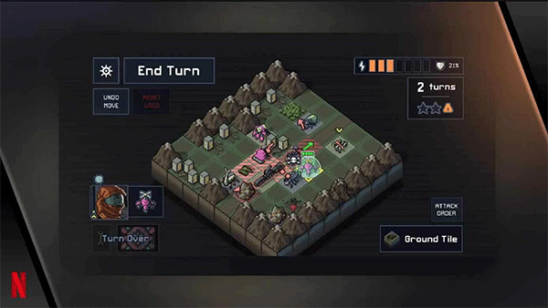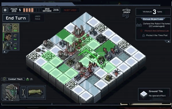 在“Into The Breach”的游戏机制中,应当将HP视为一种为了获得胜利而可消耗的资源。 不要害怕让机甲去吸收较低的伤害,为了保护人类建筑,绝对值得这样做。 还有,机甲的死亡不会让它被破坏,只是 0 HP。 如果有被动的技能可以治疗它们,它们将在没有飞行员的状态下重启并继续战斗。 损失“机师”(Pilot)可能会让你感到不舒服,但损失一名机师并不会让游戏“结束”。 即便任务失败,也可以将一名机师传送回另外一条时间线,保留所有的经验和已解锁的能力。 “培养-保护-继承”王牌机师就成为核心战略。 因为每次只允许传送回一名机师,所以小队中另外两位基本上算是“易耗品”。