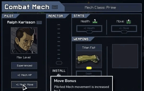 每个机甲都由一名机师驾驶,当他们升级时,会自动解锁被动技能。 在每次“战役”重新开始时,你可以选择一名已经解锁一项被动技能的机师。 对于初学者来说,Abe Isamu是一个不错的选择,因为他能够增加机甲的装甲,降低直接攻击造成的“1点”伤害值。 在游戏初期,Abe的机甲可以作为小队中的Tank去吸收怪兽造成的伤害并阻止其对建筑物的射击。 如果你疏于谋略,Isaac Jones给你一次额外“重置”(Reset)战斗的机会。 另外,高级的机师需要“能力核心”来激发他们的能力,也就是说他们需要坚持到战役后期才会有用武之地。 最好留给更有经验的玩家来指挥他们吧。