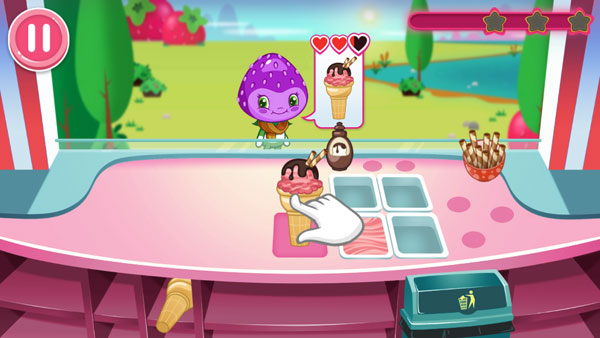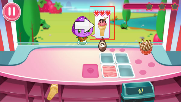 2、游戏的开始会有新的顾客,他们头上都会有三颗心心,根据客人提出的冰淇淋类型做出来。