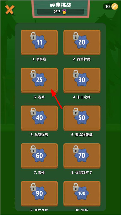 3、打开经典挑战玩法,玩家即可看到有不同的关卡,例如恐高症、溜冰、跷跷板等,玩家选择自己想玩的关卡即可。
