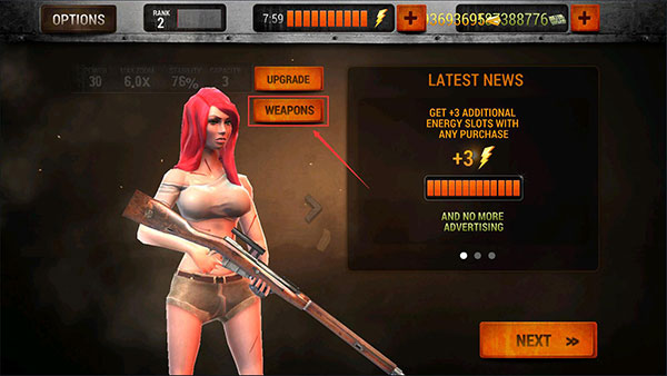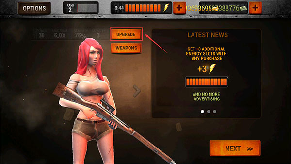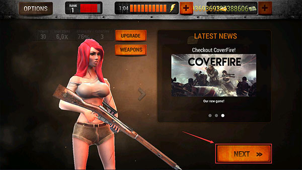 1、进入僵尸猎人死亡之战游戏之后,点击右下角的【NEXT】按钮,准备开始冒险。