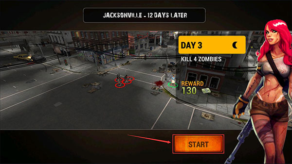 3、这时候会显示地图中大概的形势预览,脚下有红色光圈的是敌方僵尸,绿色光圈的是我方平民,点击右下角的【START】按钮开始战斗。