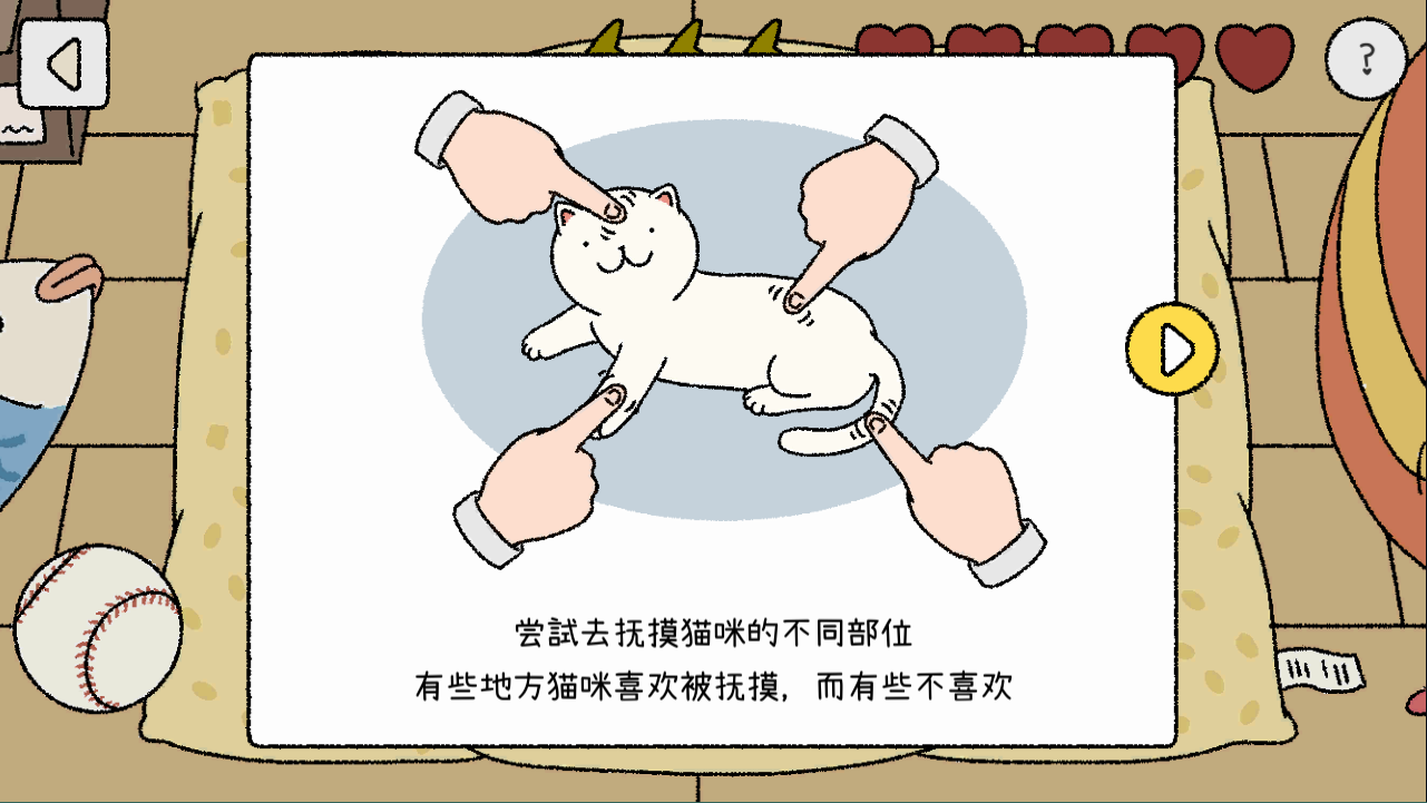 ②给喵喵做抚摸操作,需要在喵喵做出不同动画时抚摸不同的部分,比较简单,玩几次后感觉比较无趣。