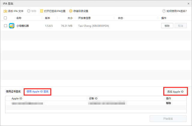 第三步、当选择IPA文件完成后,点击左下方“使用Apple ID 签名”,如果列表中没有可用ID,则需要在右方点击“添加Apple ID”按钮,并选择添加操作。