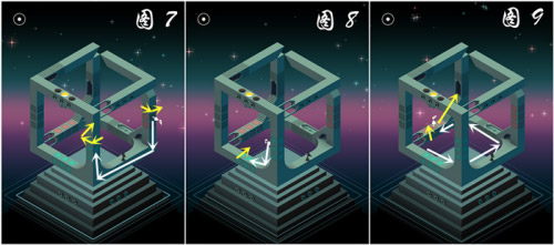 回到粉色变向机关道路,经过乌鸦人下方回到平衡的蓝色变向机关道路上,调整变向机关道路方向,走到下方横向蓝色变向机关道路上,改变道路方向,房艾达沿正方体内侧行走到横行粉红色变向机关道路上,改变方向,进入房间门。