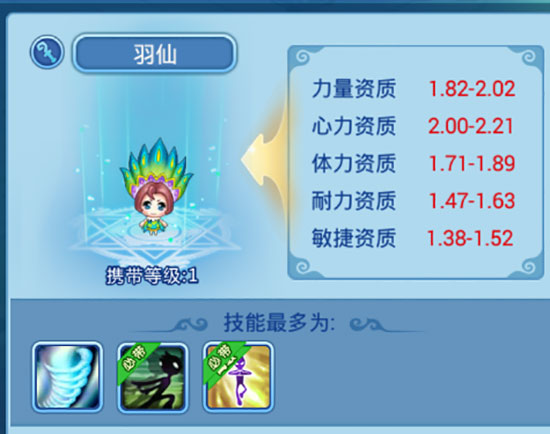 达到充值一定额度后赠送—羽仙,必带技能群法风兮云卷破、高级圣灵、疾风突进。