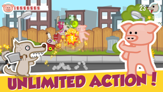 战斗小猪ios版是独立游戏工作室Snout Up打造的一款2D休闲趣味动作小游戏,该游戏采用简约激萌的手绘卡通画风来设计,整体画面柔和细致,色彩搭配丰富多样,场景刻画十分细致,小猪和大灰狼的造型都非常Q萌可爱,战斗过程中出现大片的血腥画面也并不会让人产生不适感,再加上那种金属撞击以及拳拳到肉的击打声音,给人印象十分不错!
