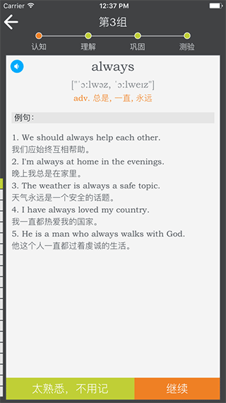 4、我爱背单词独具创新的熟悉度系统,你在翻过每个单词的时候,熟悉度就会增加1点;