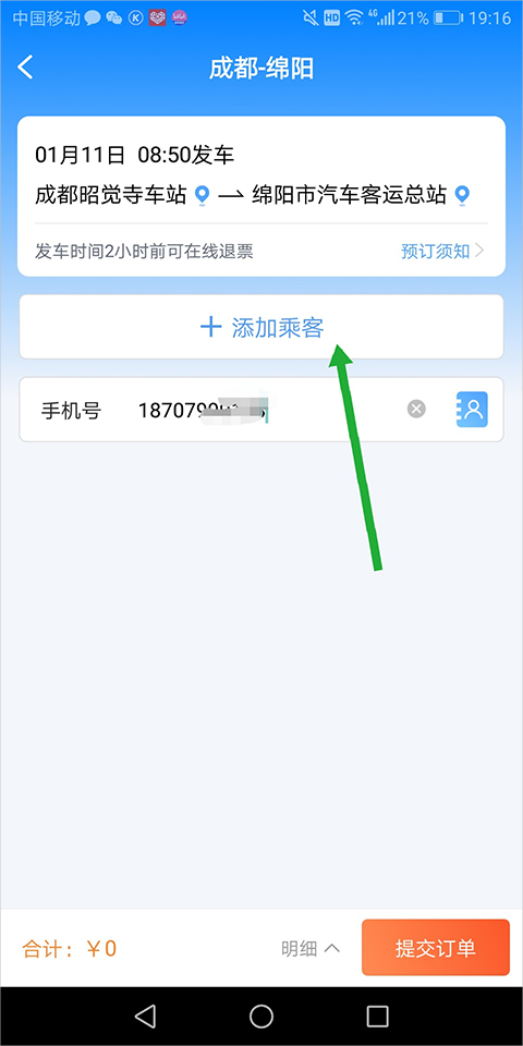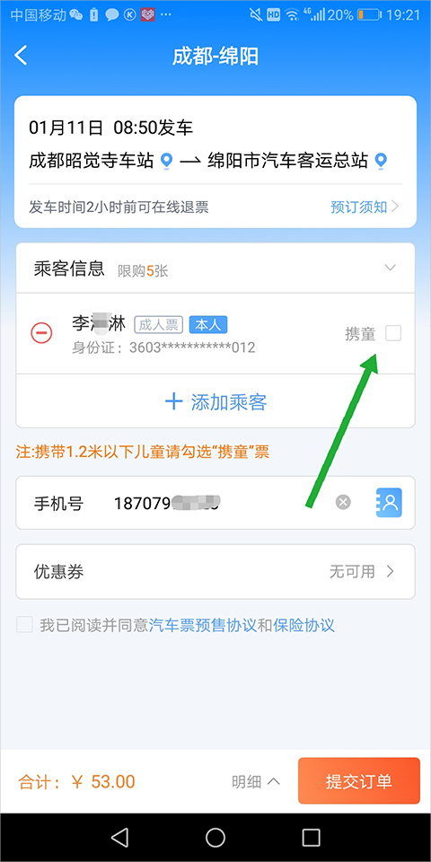5、最后用户再次确认自己的信息点击【提交订单】按钮进行支付即可,如果有携童需求可以选择下图绿色箭头所指区域的复选框进行勾选