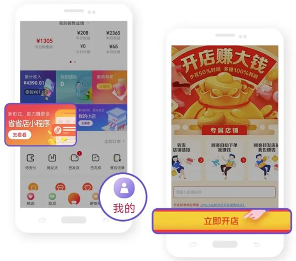 1、进入唯代购app【我的】一点击【省省店小程序】,点击立即开店填写店铺名
