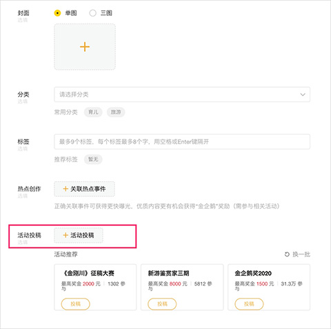 2、 活动约稿等全员参与商业化项目可在创作者发文后台-内容发布—底部选择活动勾选即可参与。