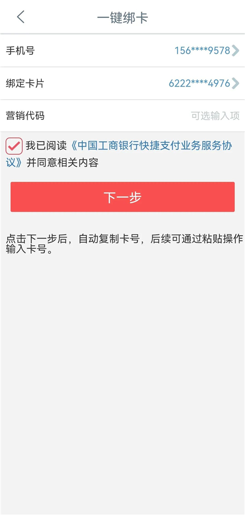 3、卡启完成后,您如果需要开通工银e支付、微信、支付宝、京东、美团等支付功能,可以点击“一键绑卡”。