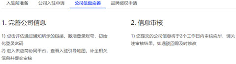 2、如您的入驻申请被驳回,请及时修改并提交;如您的评估通过,可依照提示登录后台系统完成后续步骤;如您的入驻申请被拒绝,需等待7日后方可发起二次入驻申请