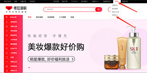 1、首先进入考拉海购官网,然后在“更多”栏目中选择“招商合作”,