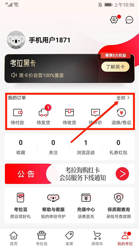 2、进入用户中心界面,选择“考拉黑卡”选项,