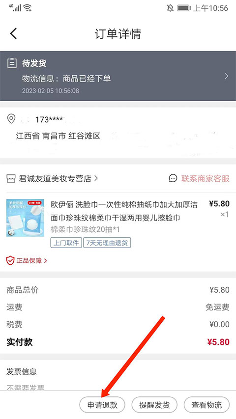 4、进入订单详情界面,选择下方“申请退款”选项,