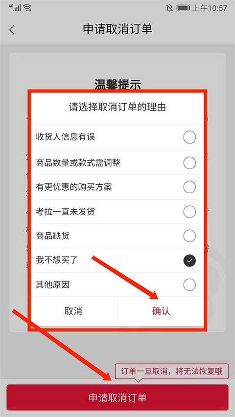 5、选择“申请取消订单”选项,然后勾选“取消理由”,最后选择“确认”即可退款。