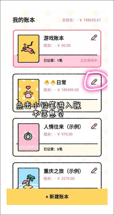 3、进入【账本】列表页面,点击账本卡片右侧的“小铅笔”按钮,即可进入账本信息页~