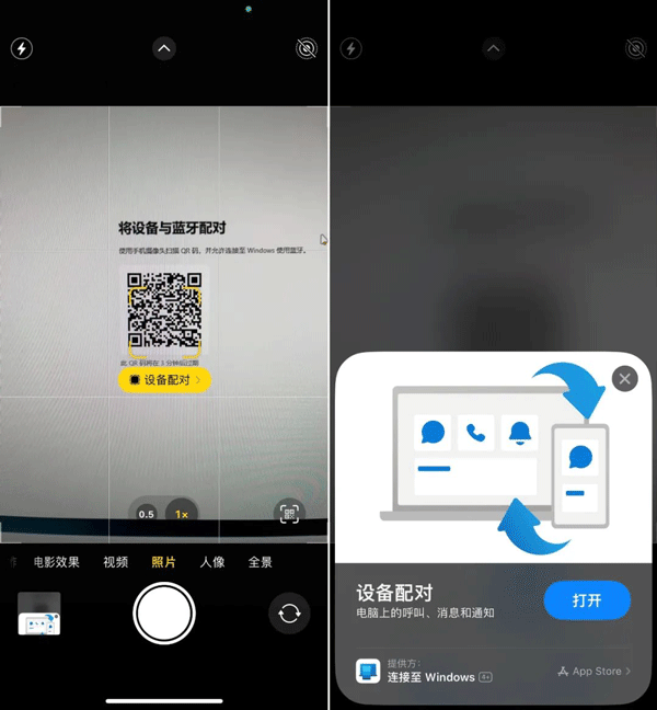 配对方式仍然采用二维码。与 Android 需要事先引导你下载「连接至 Windows」(Link to Windows )app 不同,使用原生相机识别二维码后,iPhone 会直接提示设备配对的窗口,并使用 iOS 14 引入的「轻 App」(App Clip)功能进行蓝牙连接。