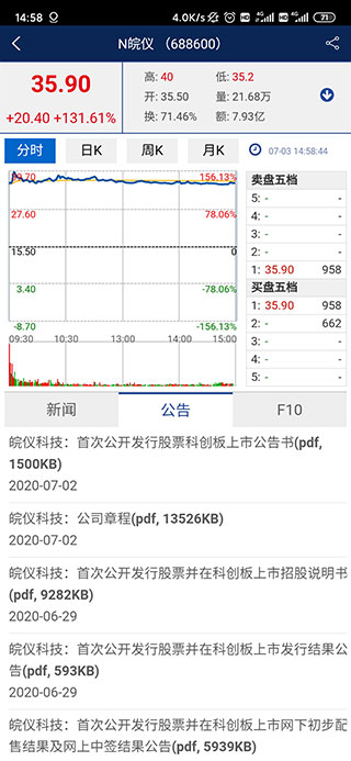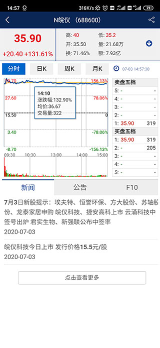 3、然后就能看到这只股票的数据了,可以分为分时、日k、周k、月k等趋势,并且在下面还能看到这只股票的新闻、公告、f10: