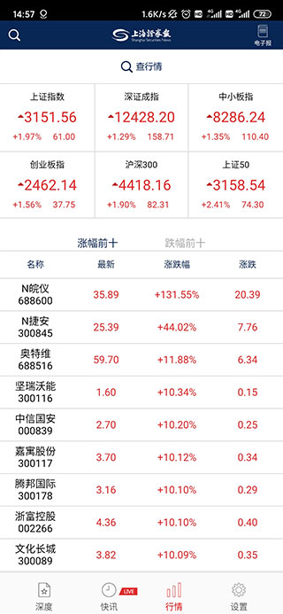 1、在本站下载安装,并且运行上海证券报软件,然后就会发现深度、快讯、行情、设置四个板块,点击行情板块: