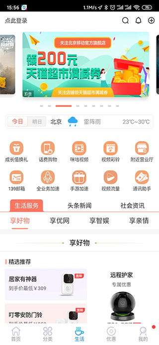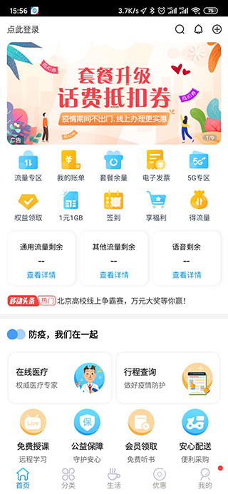 2、然后就能看到首页、分类、生活、优惠、我的五个板块,在首页中有着流量专区、我的账单、套餐余量、电子发票、5g专区、权益领取等功能: