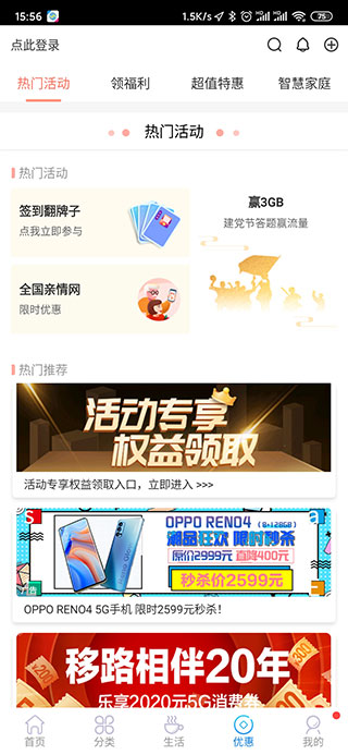 5、在优惠中有着丰富的活动,列如签到翻牌子、赢3gb、全国亲情网等等: