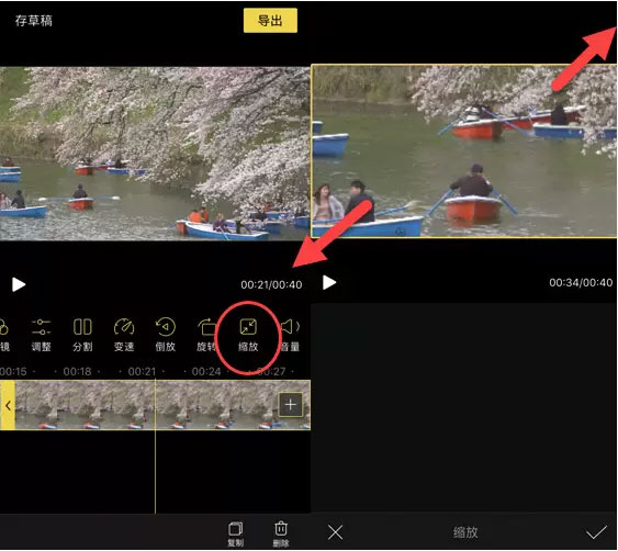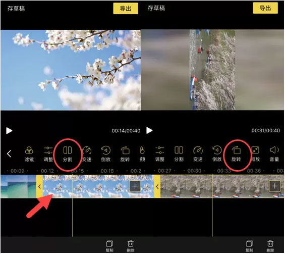 选中轨道上的素材后,就可以看到分割按钮,点击一下就能将片段分成两段,把不需要的片段点击垃圾箱就可以删除了,另外还可以通过拖拽黄色的边缘条来延长或者缩短片段的时间。如果觉得素材的方向错误,可以选中素材后点击“旋转”调整素材的方向。