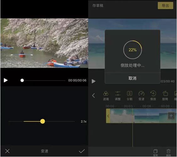 选中轨道上的素材,你可以调整视频的速度,点击“变速”按钮可以调整倍速。点击“倒放”按钮软件会自动将当前选中的片段进行倒放处理,如果想要回正常播放的效果,再次点击一下就可以返回原始状态了。