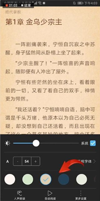 3、在阅读界面点击屏幕中间,唤出菜单栏,可以查看目录、进度,设置亮度、背景、朗读、自动翻页等。