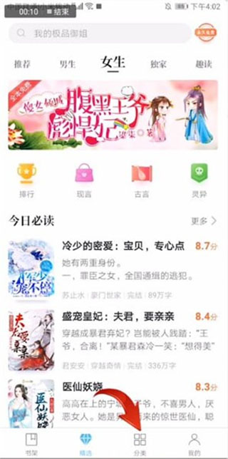 1、打开【飞读小说】,在【精选】和【分类】栏可以搜索选择喜欢的小说;也可以将喜欢的小说加入书架。