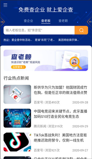 1、首先下载/安装/运行爱企查,然后就会看到如下图,有着查老板、查企业、查老赖、行业热点新闻等功能: