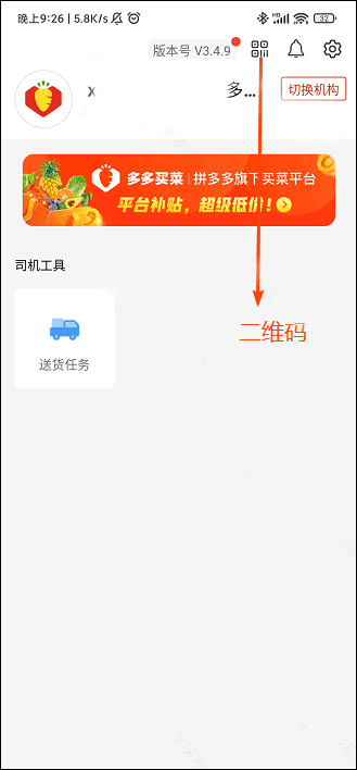 2、当多多买菜商家委托司机取退货时,让司机在【多多买菜司机APP】首页右上方,点击获取【二维码退货凭证】,此时仓库端进行扫描验证,验证通过司机才可以进行取退货: