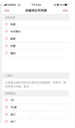 2、置几条自定义屏蔽规则,比如这里小编将“私服”、“福利”、“额度”这些敏感字设置为拦截条件;