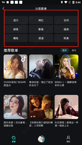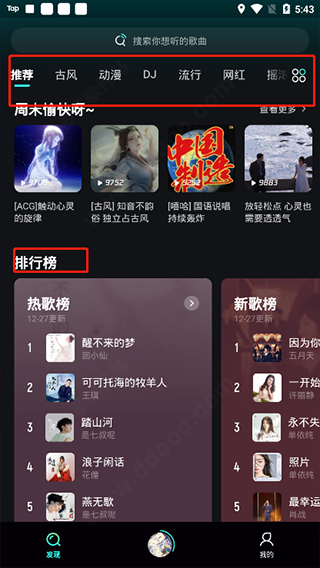2、在“发现”频道内设歌曲排行榜以及歌曲分类;
