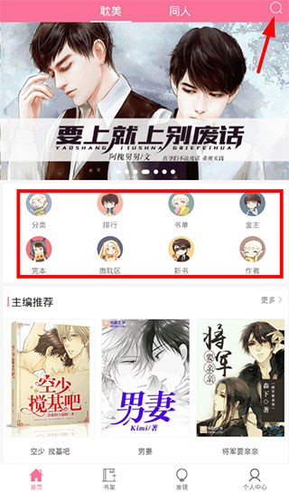 1、如果想要在书耽app中进行小说的阅读,你需要先在首页中选择自己喜欢的小说。可以到分类中查找,也可以直接通过上方搜索按钮进行搜索;