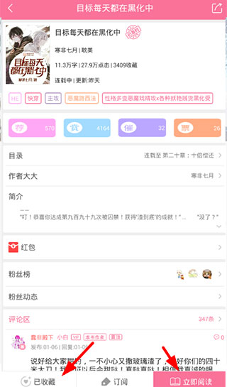 2、在点击进入了自己喜欢小说的阅读界面后,通过下方的按钮就可以对该小说进行收藏或直接点击阅读了;