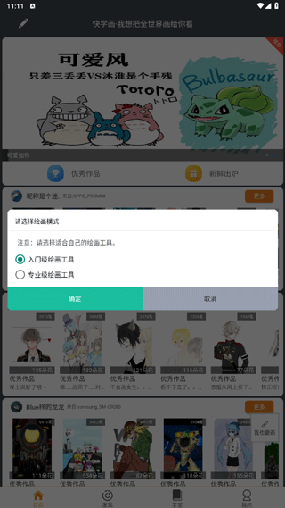 2、选择适合自己的绘画模式,入门级绘画工具主要侧重于素描,专业级绘画工具增加了画布背景和更多的画笔选项。