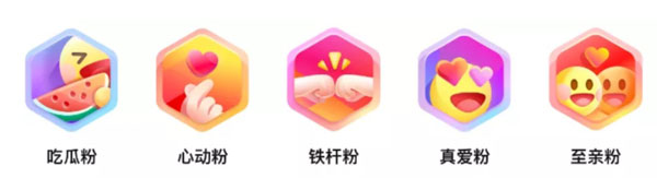 粉丝徽章-已上线:粉丝身份标识,不同等级粉丝可解锁不同粉丝徽章,粉丝等级共5级,依次递增为吃瓜粉-心动粉-铁杆粉-真爱粉-至亲粉。