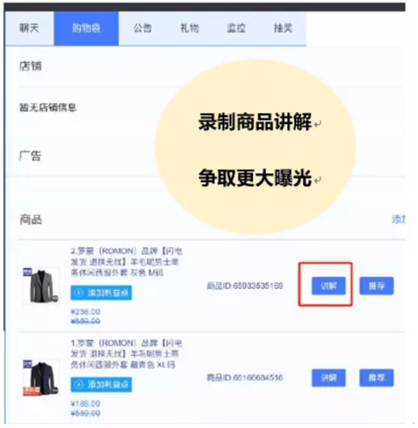 (1)录制商品讲解视频,争取直播间更大公域曝光。