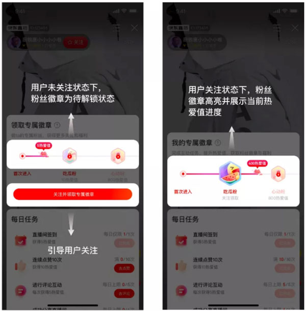 直播将粉丝热爱值,通过数值、等级、徽章、互动面板形式呈现在直播间,一方面通过生动可视化的呈现,衡量和表达热爱程度;另一方面,达人和商家可通过不同的粉丝等级设置不同的权益,实现用户关系跃迁,粉丝价值放大。