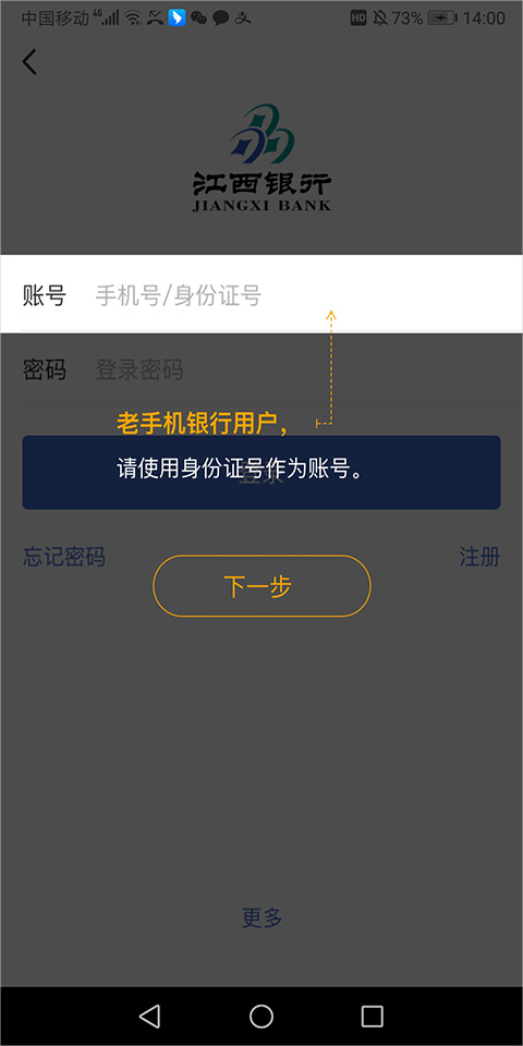 如果是老手机银行用户可以使用身份证号进行登录或注册使用