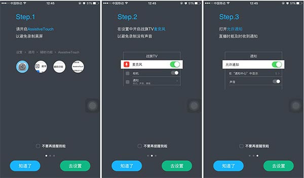 主播账号登录成功之后会提示三个权限设置,按提示设置之后方可直播