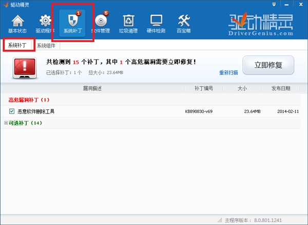 4、如果你是刚刚装的系统需要安装声卡驱动而出现这个问题,你可以先安装系统补丁。可以使用系统自带的升级程序,也可以使用驱动精灵提供的系统补丁功能。